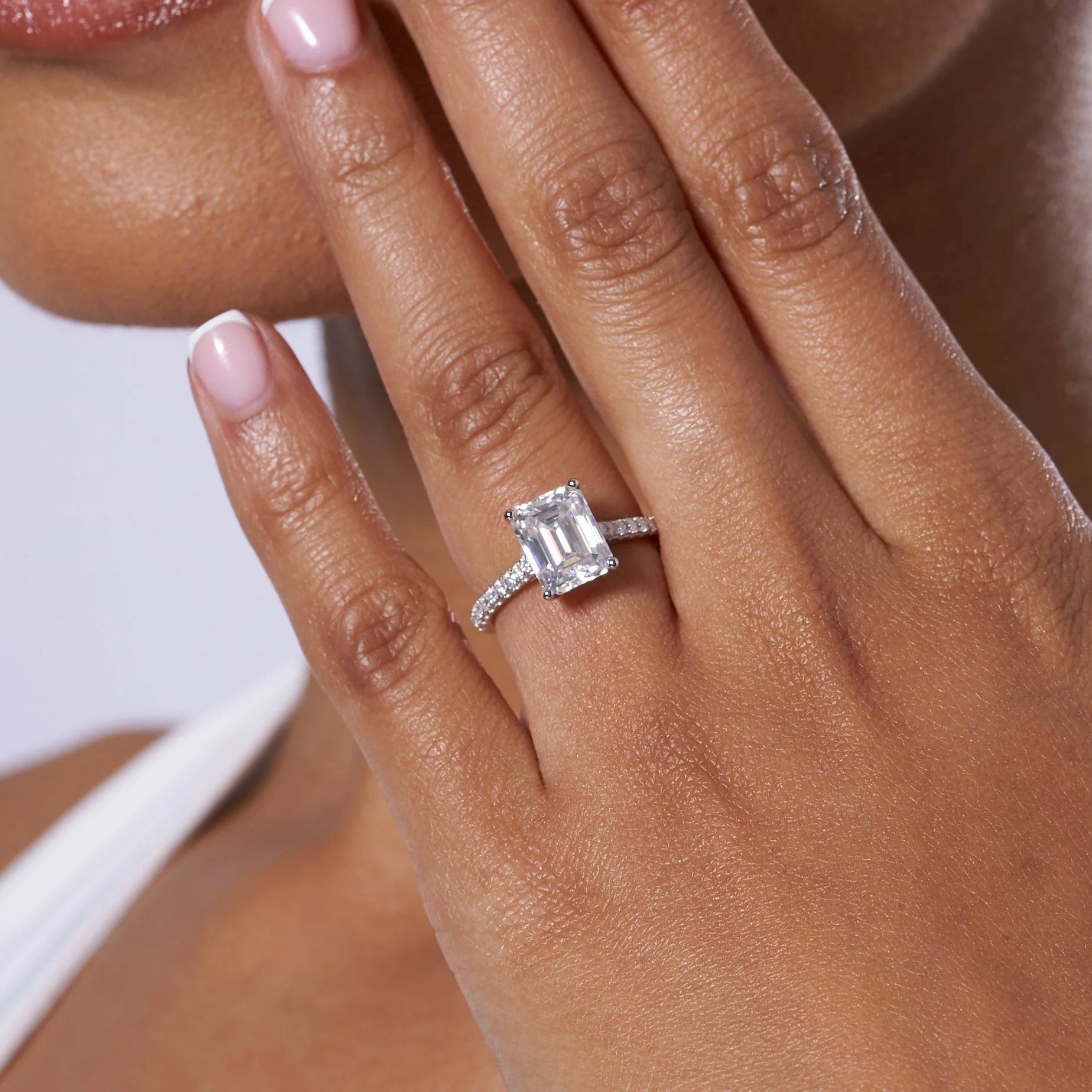Centre Stone: VVS, D Colour, Brilliant Emerald Cut Moissanite Stone